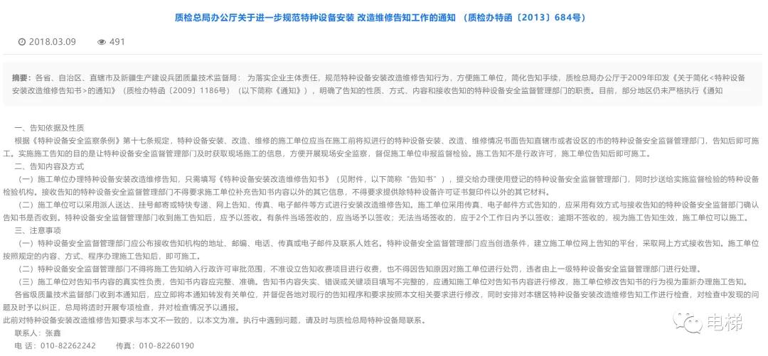 問:電梯安裝人員需要什么證件,總局能否明示? 總局回復(fù):《市場監(jiān)管總局關(guān)于特種設(shè)備行政許可有關(guān)事項的公告》〔2019年 第3號〕已明確,特種設(shè)備作業(yè)人員資格認定分類與項目已不包括電梯安裝,電梯安裝人員不需要持市場監(jiān)管部門頒發(fā)的作業(yè)人員證。同時,電梯安裝告知應(yīng)當(dāng)依據(jù)《質(zhì)檢總局辦公廳關(guān)于進一步規(guī)范特種設(shè)備安裝改造維修告知工作的通知》(質(zhì)檢辦特函〔2013〕684號)執(zhí)行。