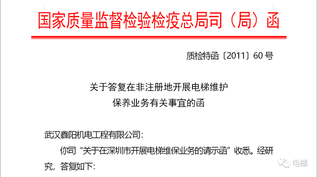 總局回復(fù):該文件未廢止。在非注冊地開展維保業(yè)務(wù)的企業(yè),應(yīng)當通過設(shè)立辦事場所、配置本單位持有電梯修理項目《特種設(shè)備作業(yè)人員證》的職工以及固定電話和必要的設(shè)備、工具與檢測儀器等,認真履行相關(guān)安全技術(shù)規(guī)范規(guī)定的職責(zé),特別要滿足“能夠及時抵達所維護保養(yǎng)電梯所在地”的要求,并主動接受和配合當?shù)乇O(jiān)管部門的監(jiān)督管理。 問:關(guān)于安裝聲控電梯