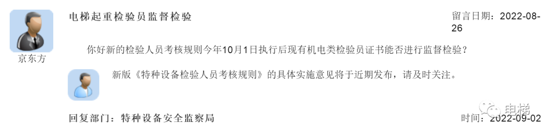 04 問(wèn):電梯起重檢驗(yàn)員監(jiān)督檢驗(yàn) 你好新的檢驗(yàn)人員考核規(guī)則今年10月1日?qǐng)?zhí)行后現(xiàn)有機(jī)電類(lèi)檢驗(yàn)員證書(shū)能否進(jìn)行監(jiān)督檢驗(yàn)? 總局回復(fù):新版《特種設(shè)備檢驗(yàn)人員考核規(guī)則》的具體實(shí)施意見(jiàn)將于近期發(fā)布,請(qǐng)及時(shí)關(guān)注。