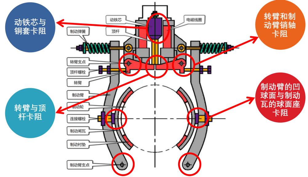 01 問題一:“老舊電梯”杠桿式鼓式制動(dòng)器風(fēng)險(xiǎn)隱患。 部分老舊電梯主要零部件由于設(shè)計(jì)缺陷以及維護(hù)保養(yǎng)不到位,存在安全隱患。如杠桿式鼓式制動(dòng)器及其伸入式松閘頂桿(如下圖所示),在使用中因銹蝕、磨損,維護(hù)保養(yǎng)未及時(shí)做好清潔、潤(rùn)滑、檢查工作,容易出現(xiàn)動(dòng)作不靈活卡阻的情況,導(dǎo)致制動(dòng)器無法閉合或閉合不完全,使得制動(dòng)力不足,最終導(dǎo)致制動(dòng)器失效。