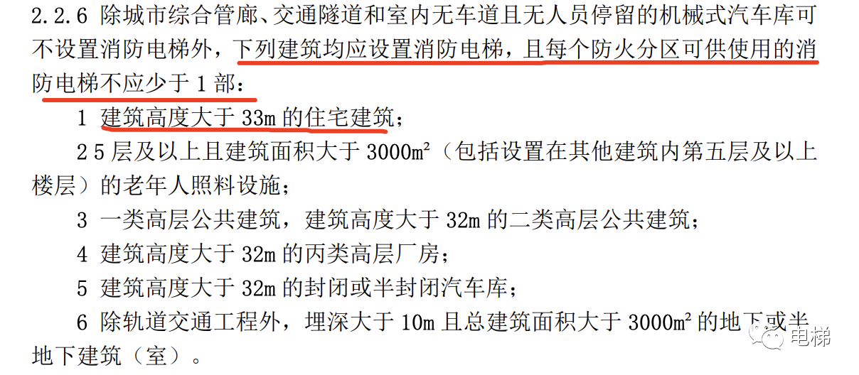 但是建筑行業(yè)都稱這種火災(zāi)中供消防員使用的電梯叫消防電梯。 可是目前我們絕大多數(shù)(超95%以上)的住宅里面安裝的消防電梯或者消防員電梯都不是真正意義上的消防電梯,而是僅僅具備消防迫降功能而已,就是在電梯基站安裝一個消防開關(guān)(一般在一個小紅盒子里裝著),該開關(guān)動作后電梯就會自動返回基站停止服務(wù),而這種假的“消防電梯”根本不具有真正消防電梯的隔煙防火防水性能。 今年6月1日開始執(zhí)行的《建筑防火通用規(guī)范》(GB55037-2022)中明確規(guī)定了必須配備消防電梯的幾種情況,其中: 高度大于33m的住宅建筑,就必須至少安裝一臺消防電梯。