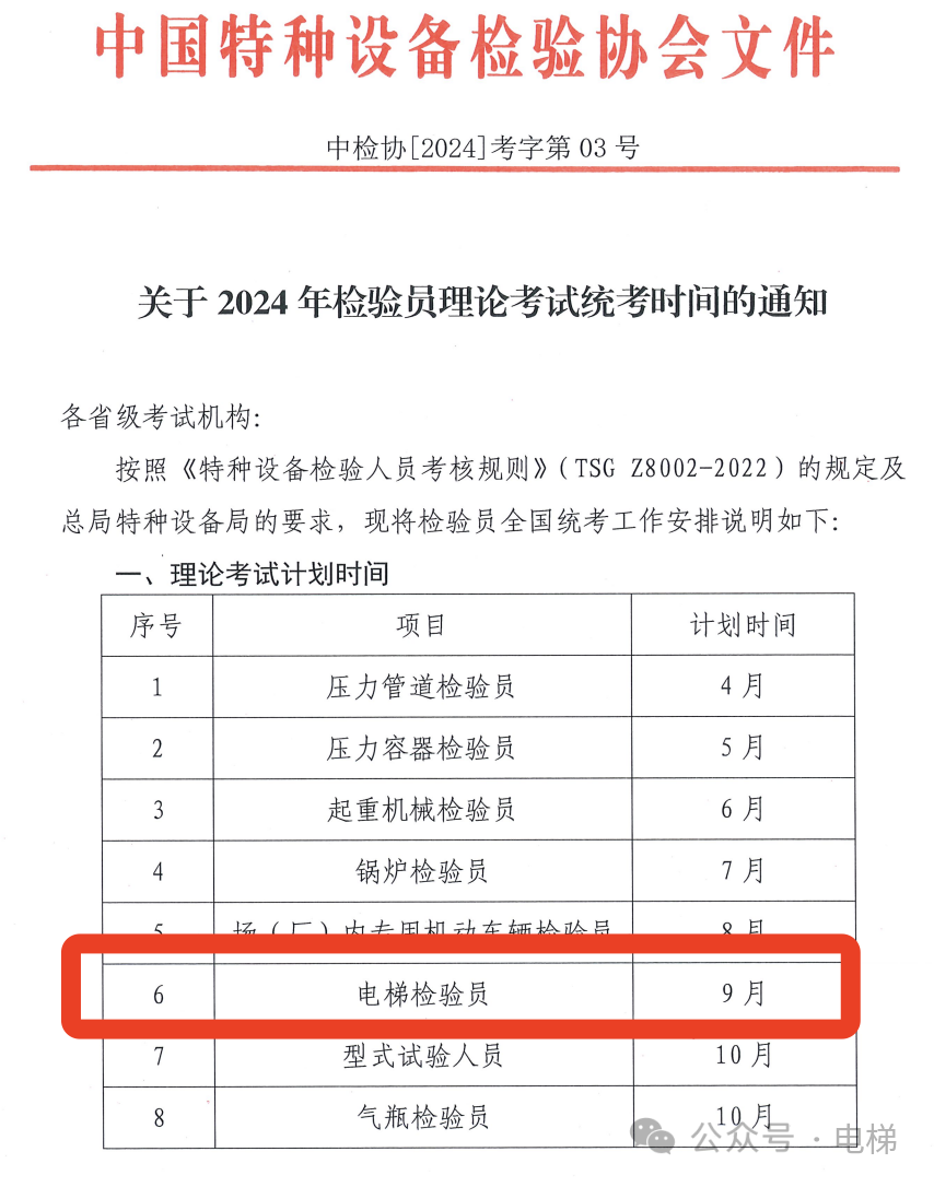 2024年1月10日中國(guó)特種設(shè)備檢驗(yàn)協(xié)會(huì)發(fā)布了今年電梯檢驗(yàn)員統(tǒng)考計(jì)劃,全國(guó)電梯檢驗(yàn)員理論統(tǒng)一考試的時(shí)間安排在9月份。