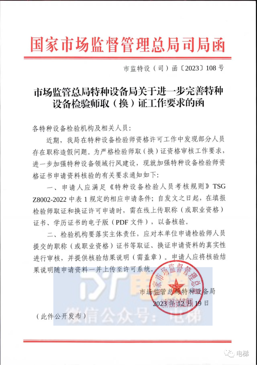 國家市場監(jiān)督管理總局司局函 市監(jiān)特設(shè)(司)函[2023]108號 市場監(jiān)管總局特種設(shè)備局關(guān)于進一步完善特種 設(shè)備檢驗師取(換)證工作要求的函 各特種設(shè)備檢驗機構(gòu)及相關(guān)人員: 近期,我局在特種設(shè)備檢驗師資格許可工作中發(fā)現(xiàn)部分人員存在職稱造假問題。為嚴格檢驗師取(換)證資格審核工作要求,進一步加強特種設(shè)備領(lǐng)域行風(fēng)建設(shè),現(xiàn)就加強特種設(shè)備檢驗師資格證書申請資料核驗的有關(guān)要求通知如下: 一、申請人應(yīng)滿足《特種設(shè)備檢驗人員考核規(guī)則》TSG Z8002-2022中表1規(guī)定的相應(yīng)申請條件;自發(fā)文之日起,在填報檢驗師取證和換證許可申請時,需在線上傳職稱(或職業(yè)資格)證書、學(xué)歷證書的電子版(PDF文件),以備核驗。 二、檢驗機構(gòu)要落實主體責(zé)任,應(yīng)對本單位申請檢驗師人員提交的職稱(或職業(yè)資格)證書等取證、換證申請資料的真實性進行審核,并提供核驗結(jié)果說明(需蓋章)。申請人應(yīng)將核驗結(jié)果說明隨申請資料一并上傳至許可系統(tǒng)。 市場監(jiān)管總局特種設(shè)備局 2021安全監(jiān)局19日 (此件公開發(fā)布)