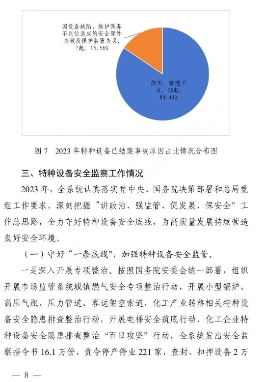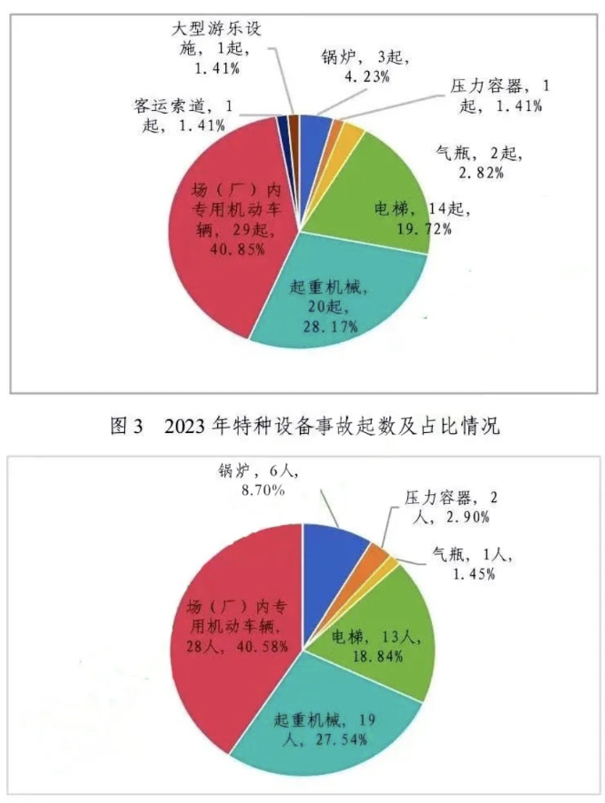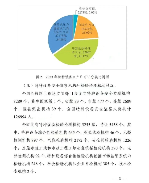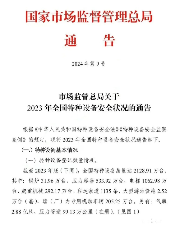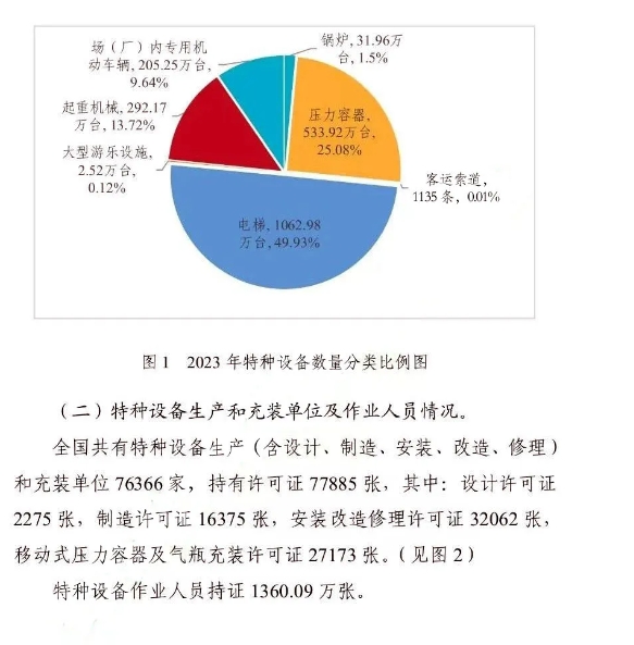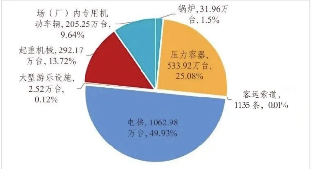 截止2023年底(下同),全國特種設(shè)備總量達(dá)2128.91萬臺。其中:鍋爐31.96萬臺、壓力容器533.92萬臺、電梯1062.98萬臺、起重機械292.17萬臺、客運索道1135條、大型游樂設(shè)施2.52萬臺(套)、場(廠)內(nèi)專用機動車輛205.25萬臺。另有:氣瓶2.88億只、壓力管道99.13萬公里(在冊)。(見圖1)