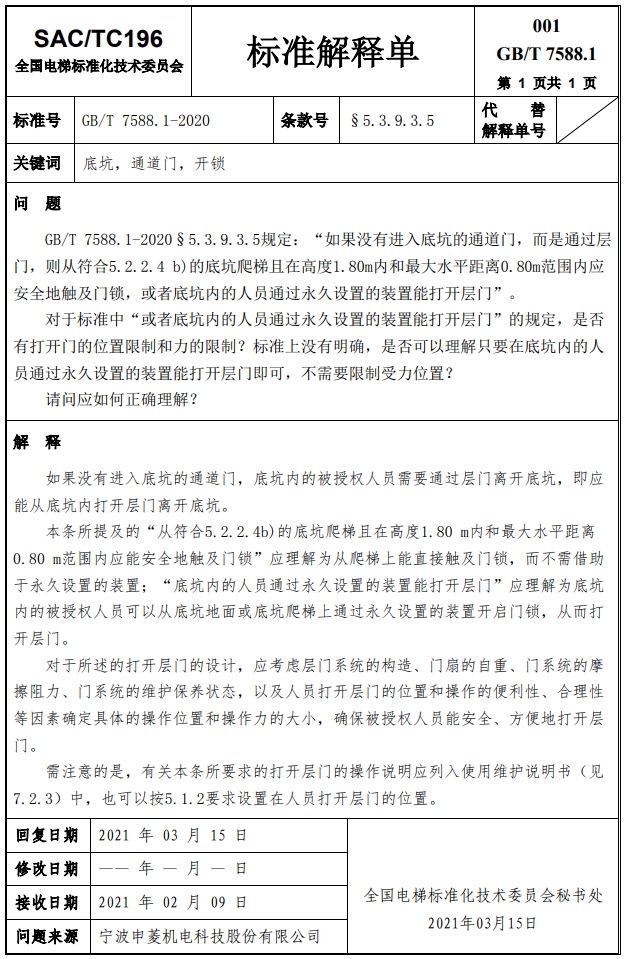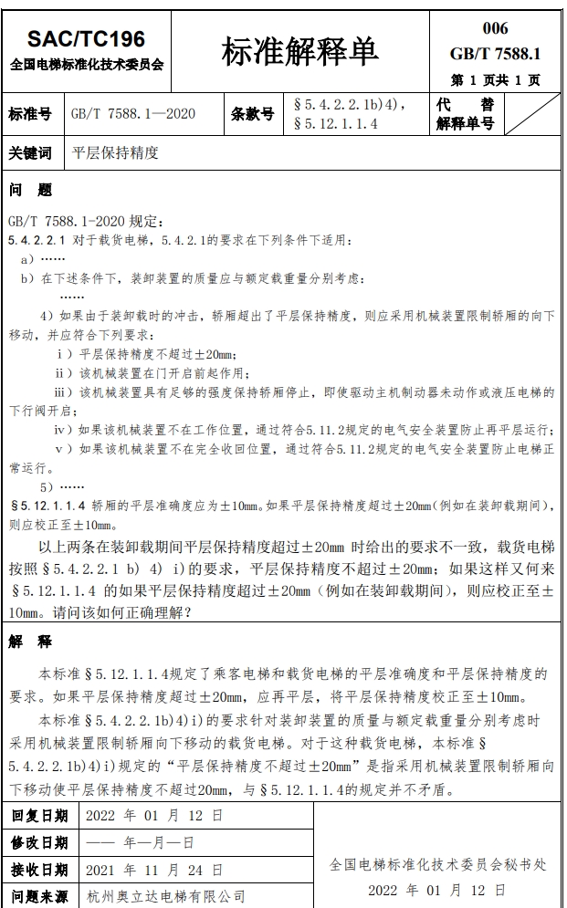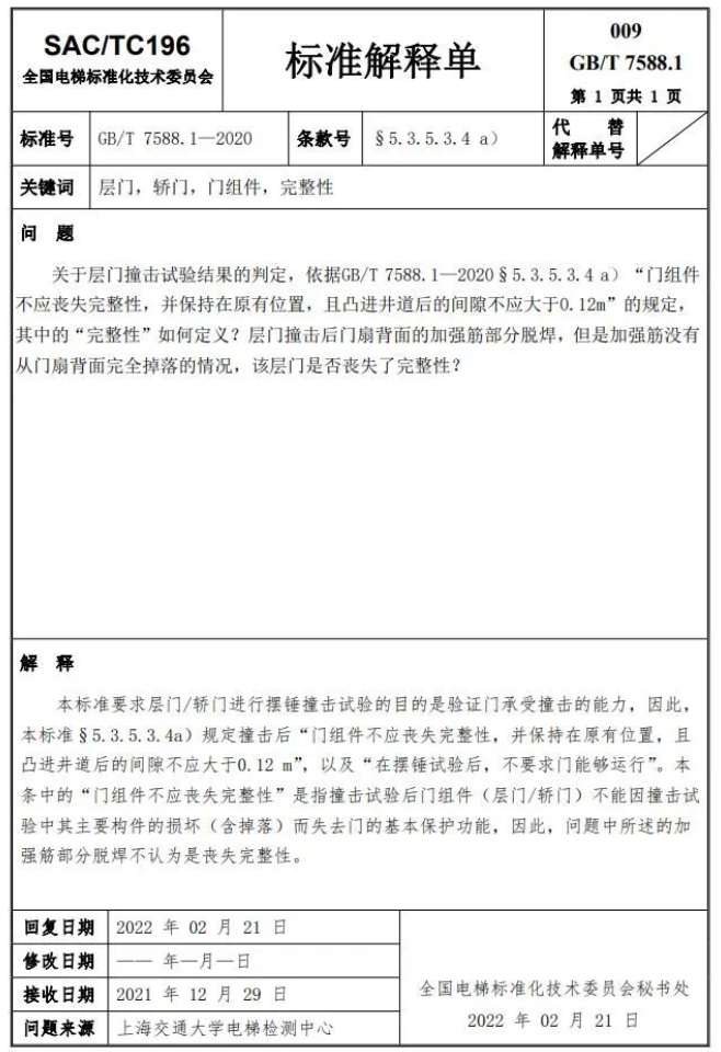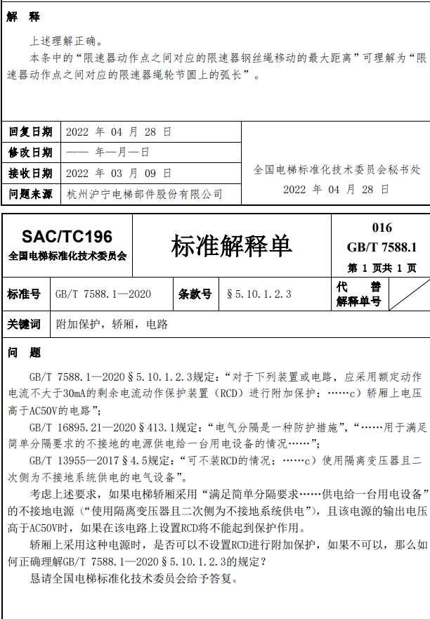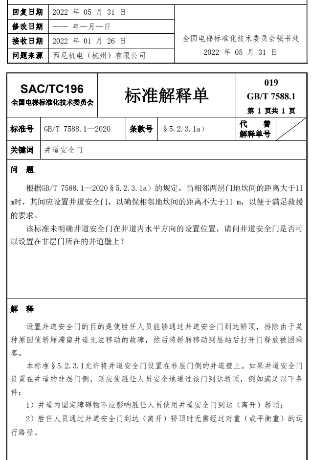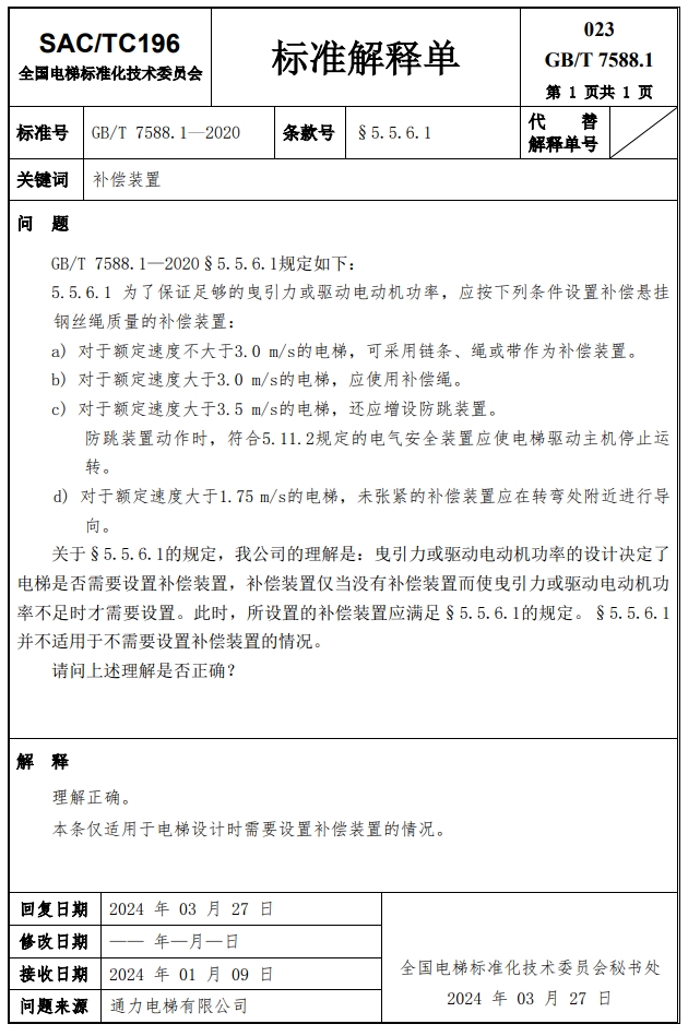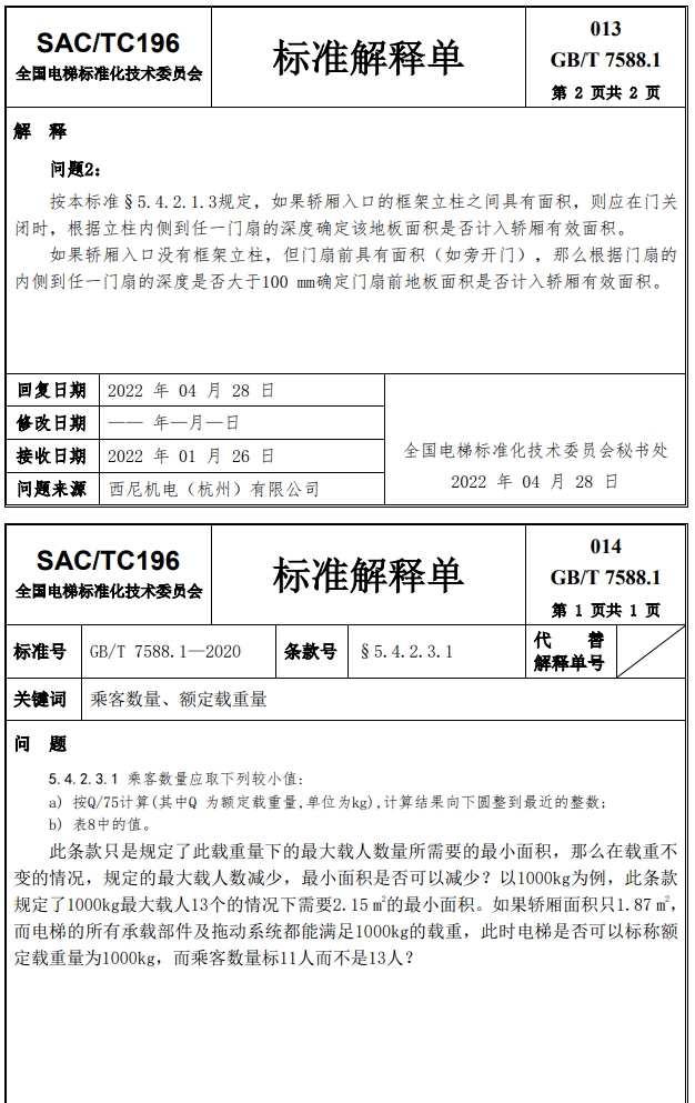關(guān)于發(fā)布GB/T 7588.1—2020《電梯制造與安裝安全規(guī)范 第1部分:乘客電梯和載貨電梯》第23號(hào)解釋單的通知 全國(guó)電梯標(biāo)準(zhǔn)化技術(shù)委員會(huì)發(fā)布了GB/T 7588.1—2020《電梯制造與安裝安全規(guī)范 第1部分:乘客電梯和載貨電梯》第23號(hào)標(biāo)準(zhǔn)解釋單(在全國(guó)電梯標(biāo)準(zhǔn)化技術(shù)委員會(huì)官方網(wǎng)站“標(biāo)準(zhǔn)解釋單”欄目中可下載)。 2024年3月27日