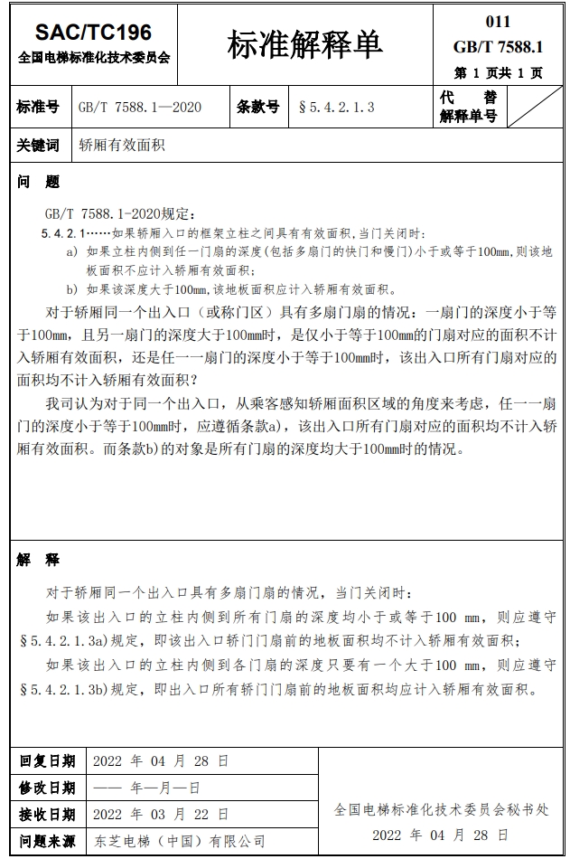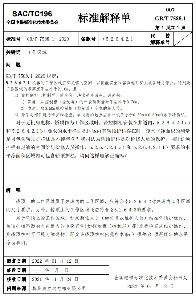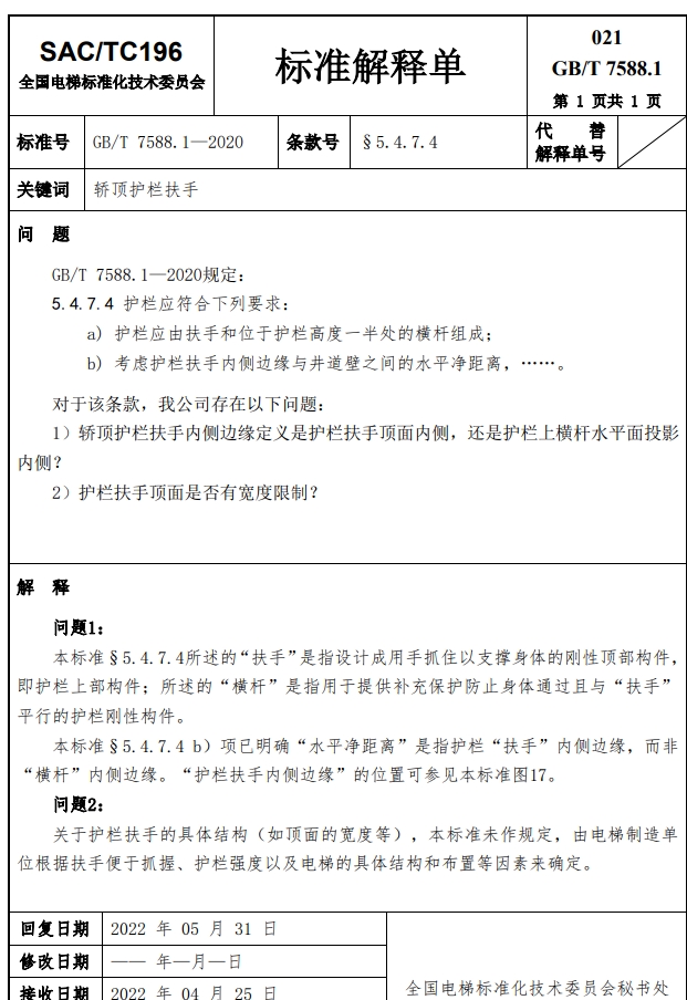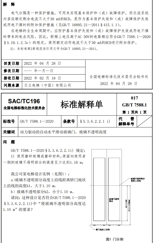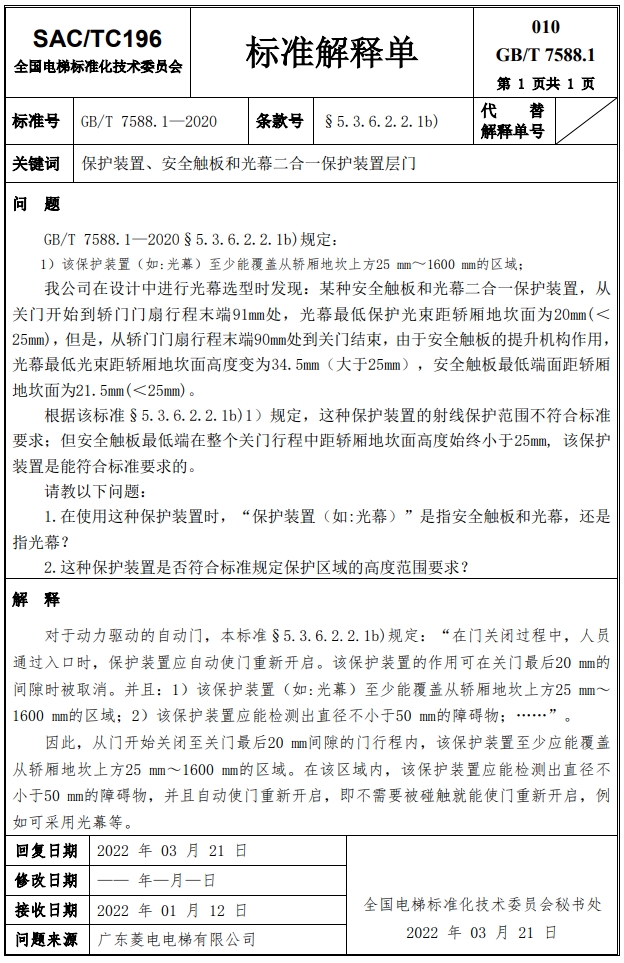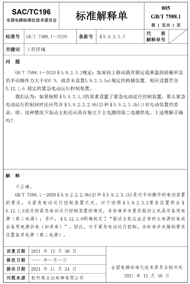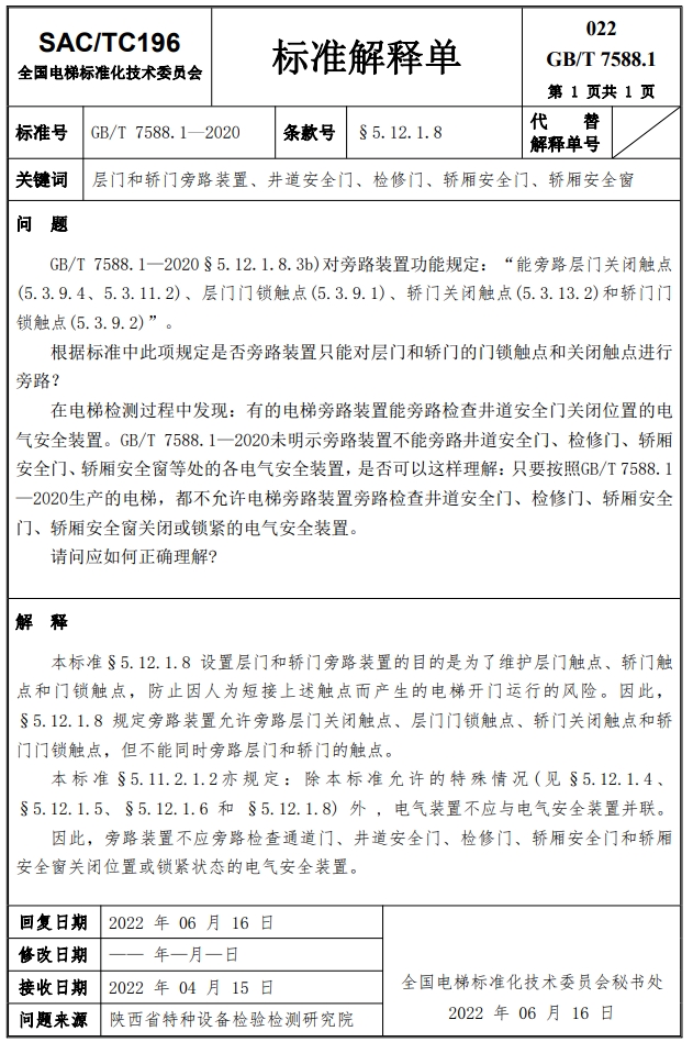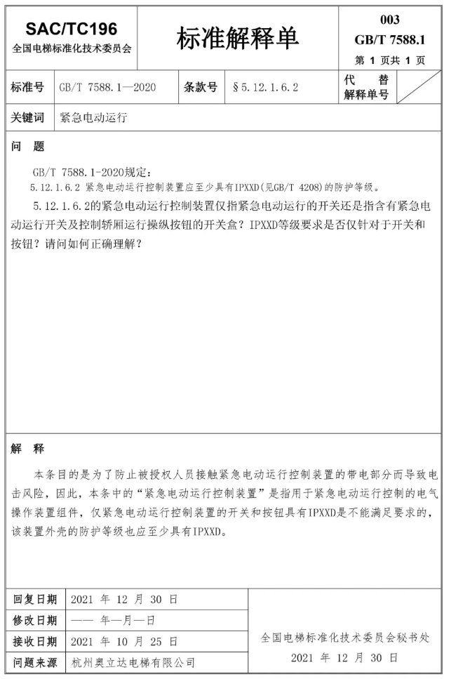 關(guān)于發(fā)布GB/T 7588.1—2020《電梯制造與安裝安全規(guī)范 第1部分:乘客電梯和載貨電梯》第23號(hào)解釋單的通知 全國(guó)電梯標(biāo)準(zhǔn)化技術(shù)委員會(huì)發(fā)布了GB/T 7588.1—2020《電梯制造與安裝安全規(guī)范 第1部分:乘客電梯和載貨電梯》第23號(hào)標(biāo)準(zhǔn)解釋單(在全國(guó)電梯標(biāo)準(zhǔn)化技術(shù)委員會(huì)官方網(wǎng)站“標(biāo)準(zhǔn)解釋單”欄目中可下載)。 2024年3月27日